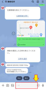 海老名市LINE公式アカウントを『ともだち追加』した後、道路の異常報告をLINEで行うことができます。